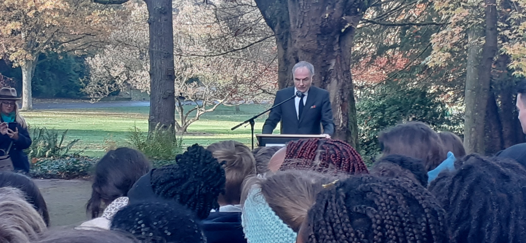Schülerinnen und Schüler bei der „Cérémonie de Commémoration de l´Armistice 1918“ (Gedenkfeier zum Waffenstillstand 1918) zum Ehrenfriedhof im Deutsch-Französischen Garten